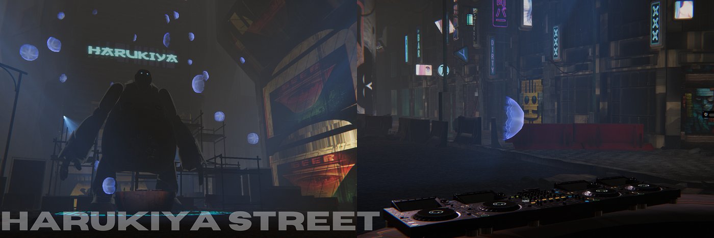 A dystopian alley at night, where mysterious genetically-modified jellyfish hover around the stage.